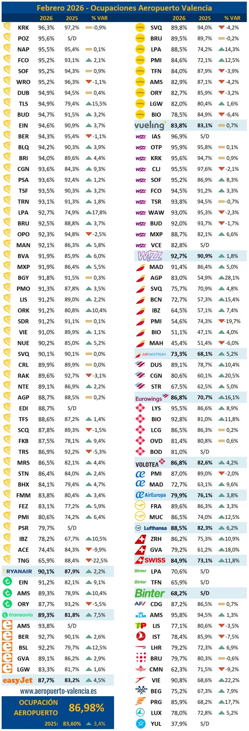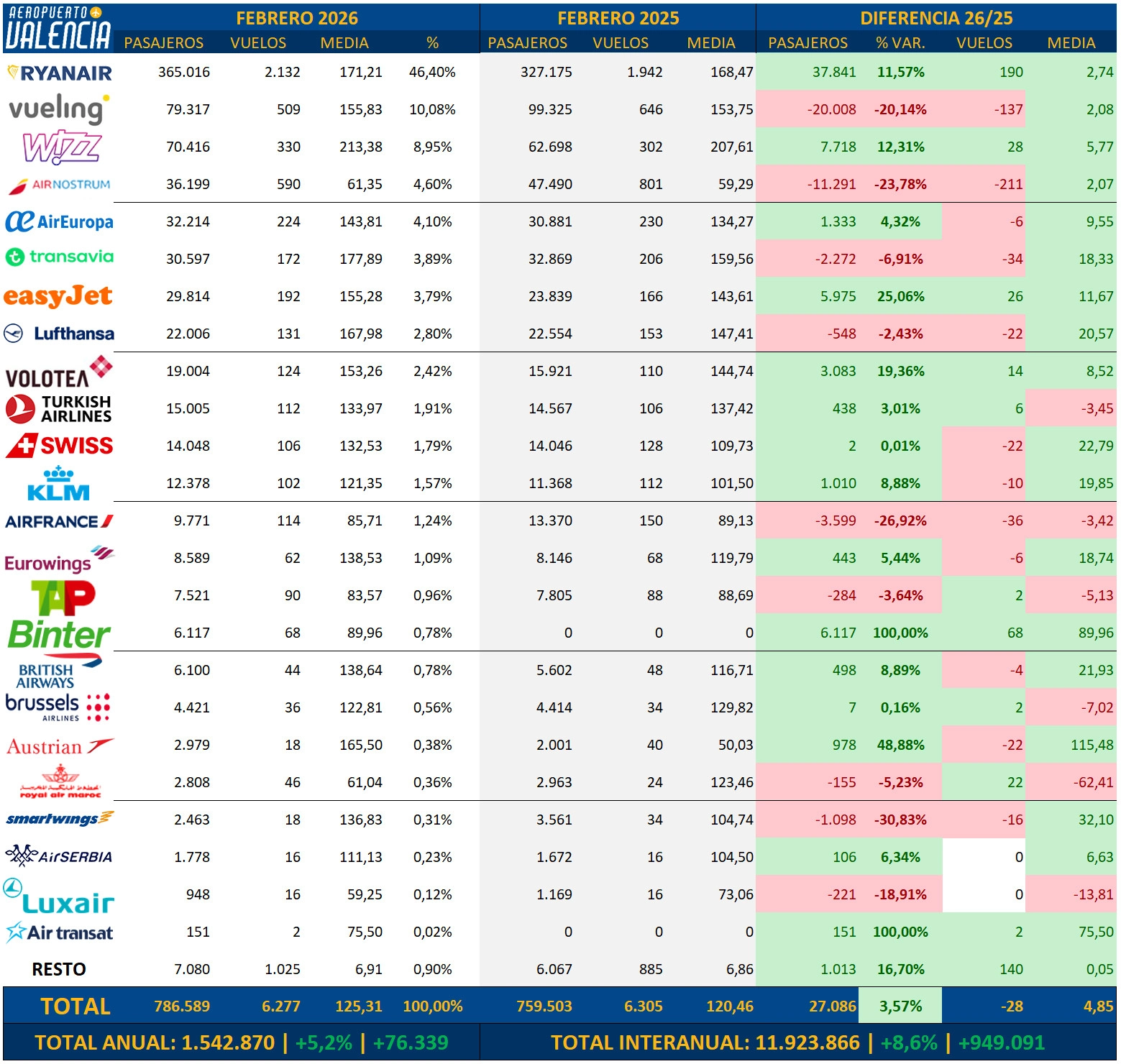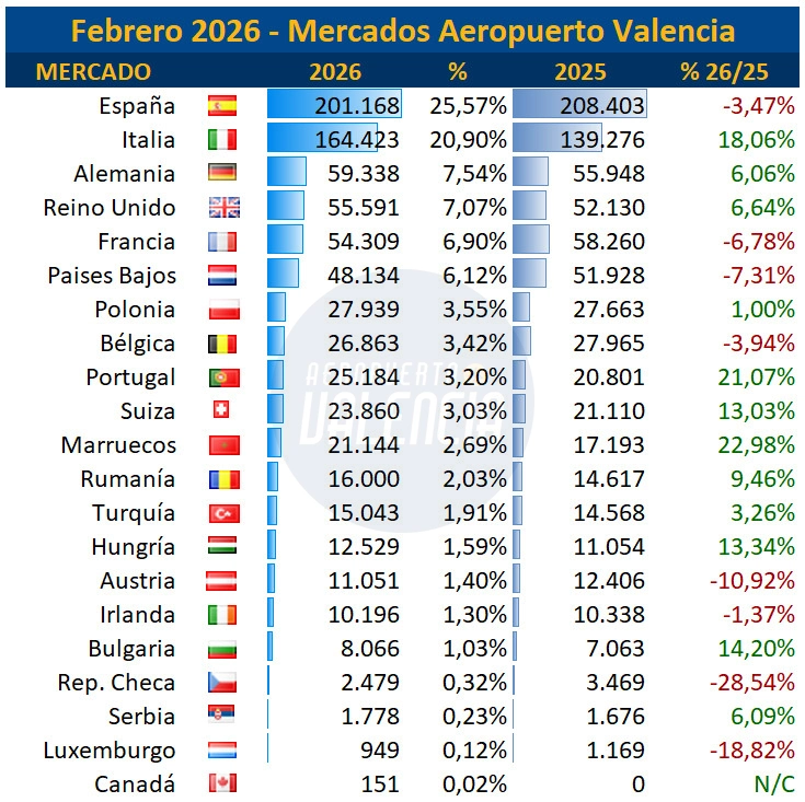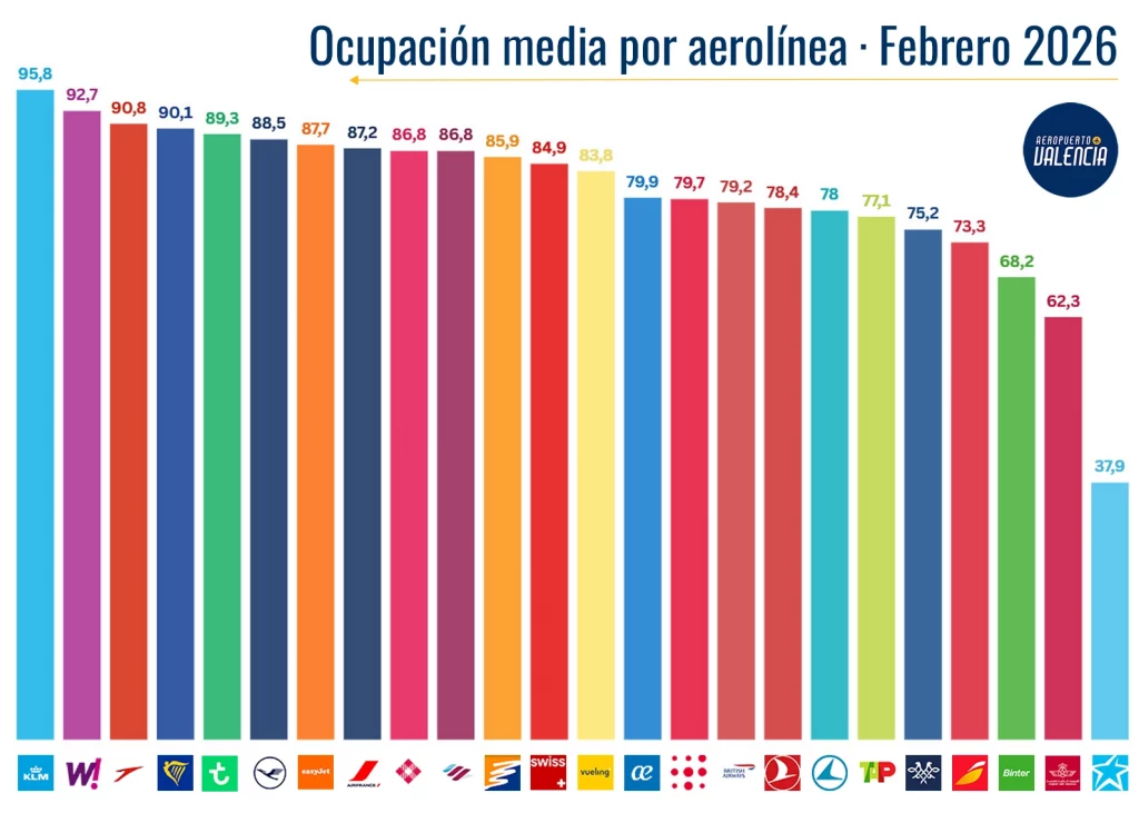 El aeropuerto de Valencia ha vuelto a registrar en el mes de febrero un nuevo récord mensual, registrando el mejor mes de febrero de la historia, rozando los 800.000 pasajeros. Un total de 786.589 pasajeros volaron desde Valencia en febrero, lo que supone un incremento del 3,57% respecto al mismo mes del año pasado, con 27.000 pasajeros de incremento.