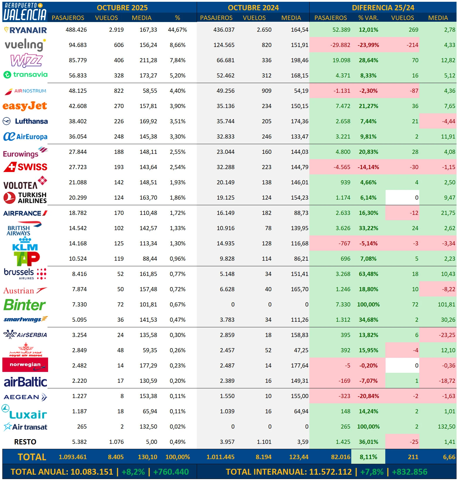 El total de pasajeros registrado en octubre ha sido de 1.093.461, que representa un incremento del 8,11%, con 82.016 pasajeros más que el mismo mes que el año pasado. El aeropuerto ya ha superado los 10 millones de pasajeros en 2025, alcanzando un total de 10.083.151 pasajeros (+8,2%), por lo que a falta de dos meses ya sería el segundo año de la historia con más pasajeros por detrás de 2024. El interanual alcanza los 11.572.112 pasajeros (+7,8%).