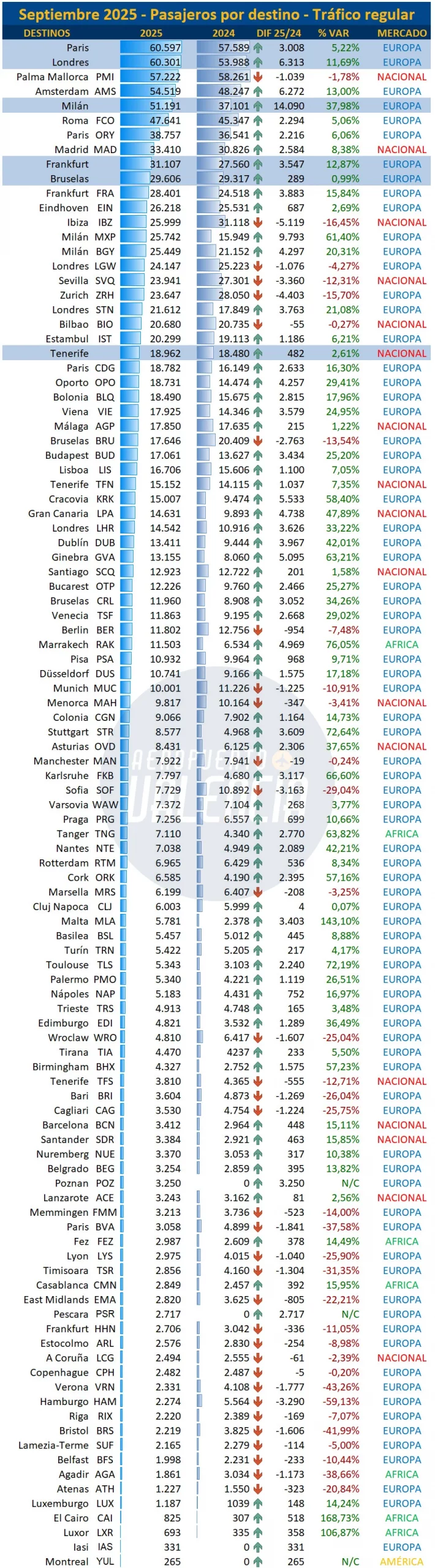 Poca novedad respecto al resto de la temporada respecto a los destinos. Las grandes ciudades europeas siguen creciendo, consolidándose París y Londres como principales destinos por ese orden. Y los aeropuertos baleares con retrocesos, especialmente Ibiza este mes por la cancelación de la ruta de Vueling. Sevilla también registra un importante descenso.