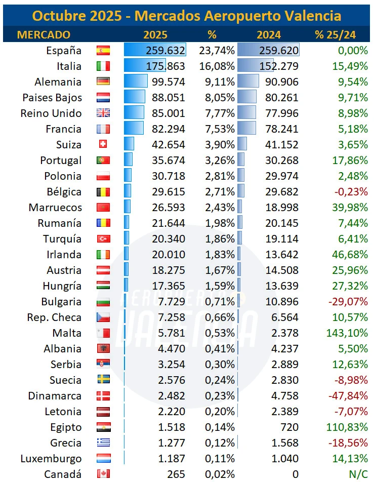 El aeropuerto de Valencia ha cerrado la temporada de verano 2025 batiendo todos sus récords de pasajeros, y superando por primera vez el millón de pasajeros en todos los meses de la temporada, desde marzo hasta octubre. El mes de octubre no ha sido una excepción y ha vuelto a batir el récord mensual, siendo el mejor mes de octubre de la historia y registrando incluso más pasajeros que el pasado mes de septiembre.