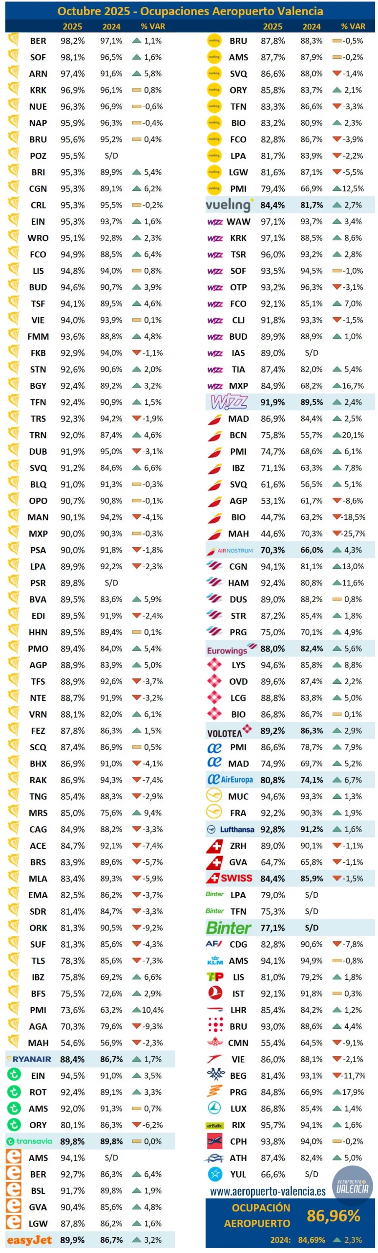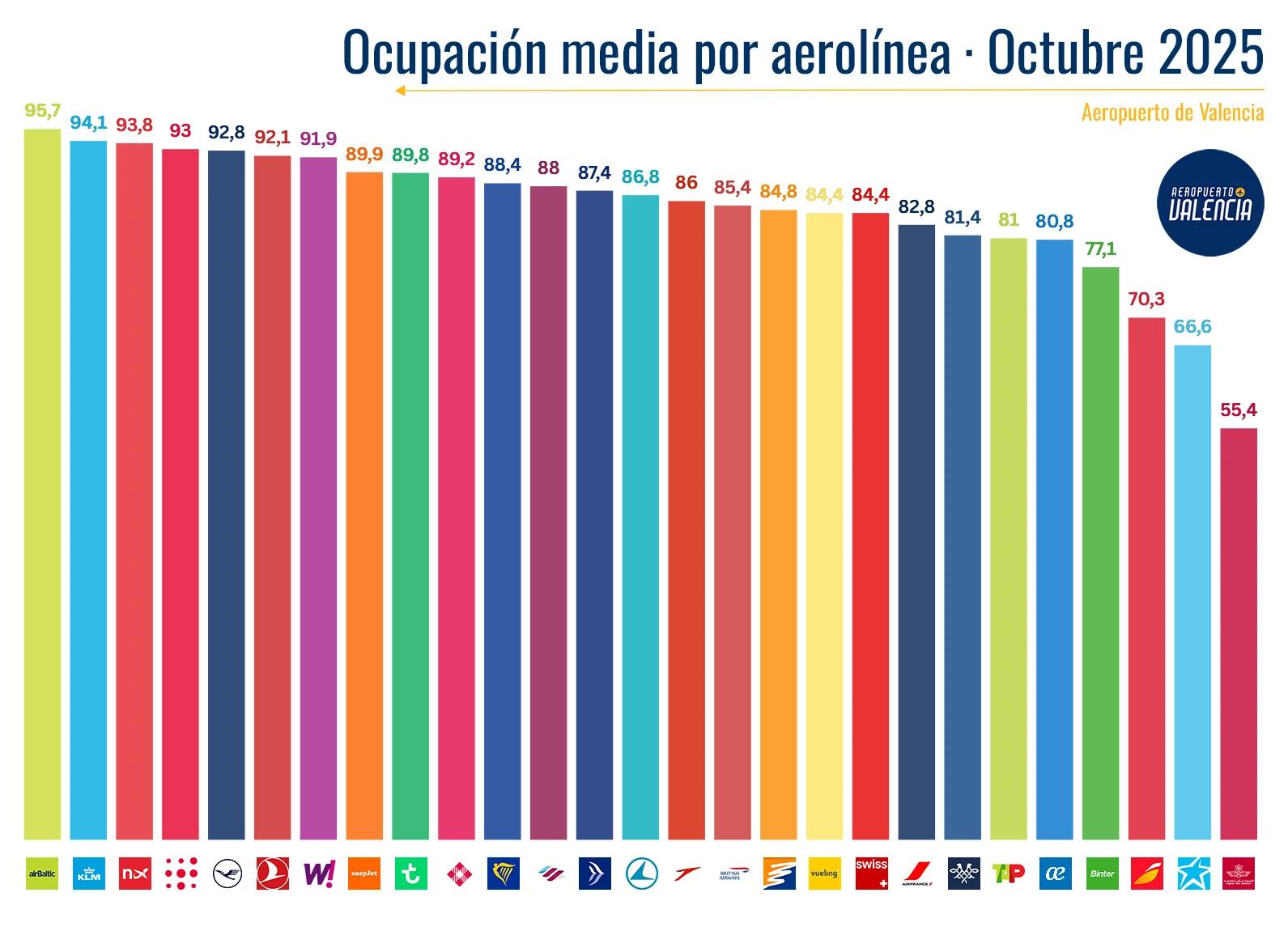 La ocupación media del aeropuerto sube 2,3% respecto a octubre del año anterior, rozando el 87%. Muchos vuelos se vieron afectados los últimos 3 días de mes del año anterior por la dana, que haría bajar alguna décima. Este mes Air Baltic registra la mayor ocupación, seguida de KLM y Norwegian, que mes tras mes está registrando unas ocupaciones bastante altas. Turkish Airlines se mantiene entre las primeras aerolíneas en ocupación, con unos números magníficos.