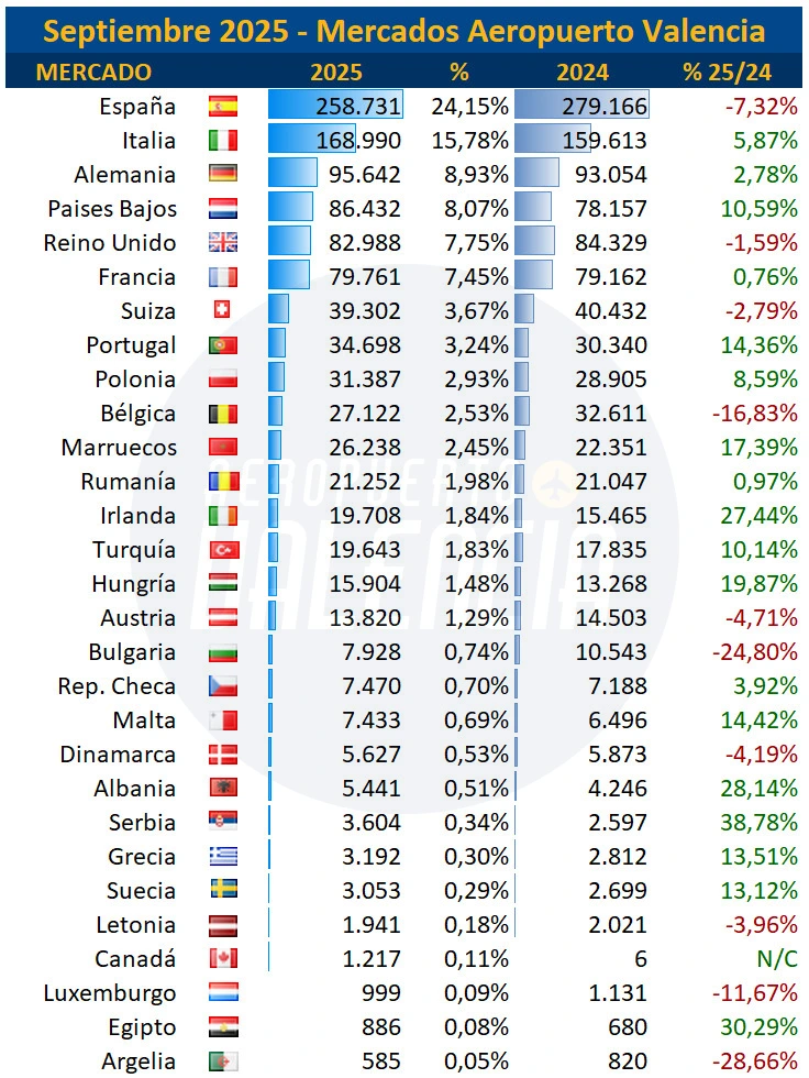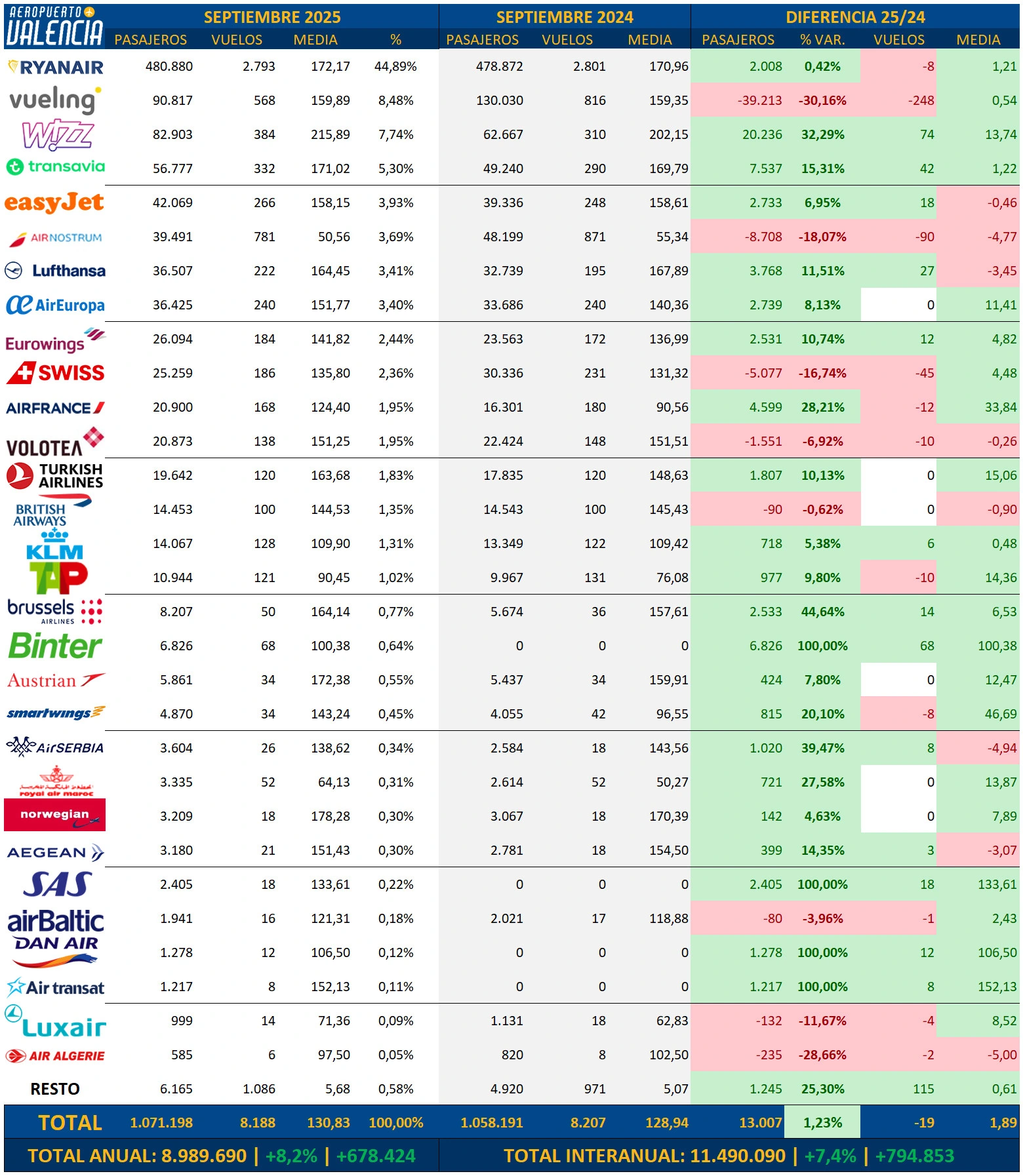 El aeropuerto de Valencia sigue batiendo récords mensuales mes tras mes, y el mes de septiembre no ha sido una excepción. Con 1.071.198 pasajeros, ha sido el mejor mes de septiembre de la historia, superando en 13.000 pasajeros al mes de septiembre del año pasado, y supone un incremento del 1,2%. Los pasajeros anuales rozan los 9 millones, suman 8.989.690 pasajeros (+8,2) y los interanuales rozan los 11,5 millones, un total de 11.490.090 pasajeros (+7,4%).