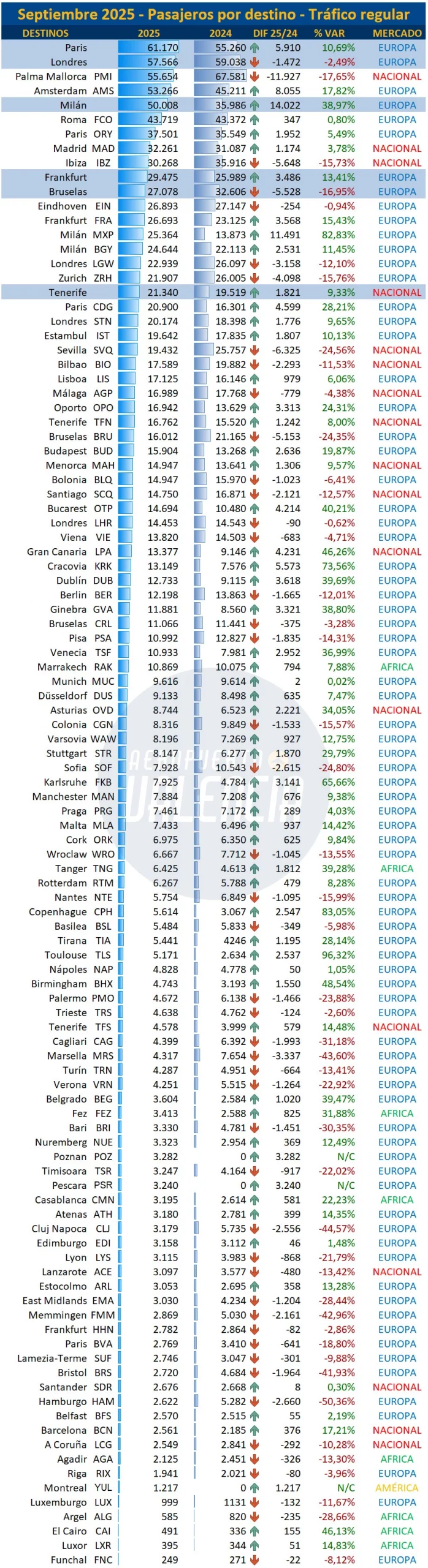 el tráfico nacional sigue bajando sus registros, Palma e Ibiza bajan significativamente y Madrid apenas se mantiene. Palma de Mallorca se mantiene como el primer aeropuerto de destino, pero Ámsterdam se sitúa muy cerca y podría arrebatarle a Palma el puesto después de muchos años de dominio de la capital balear. Los dos aeropuertos milaneses suben de forma importante.