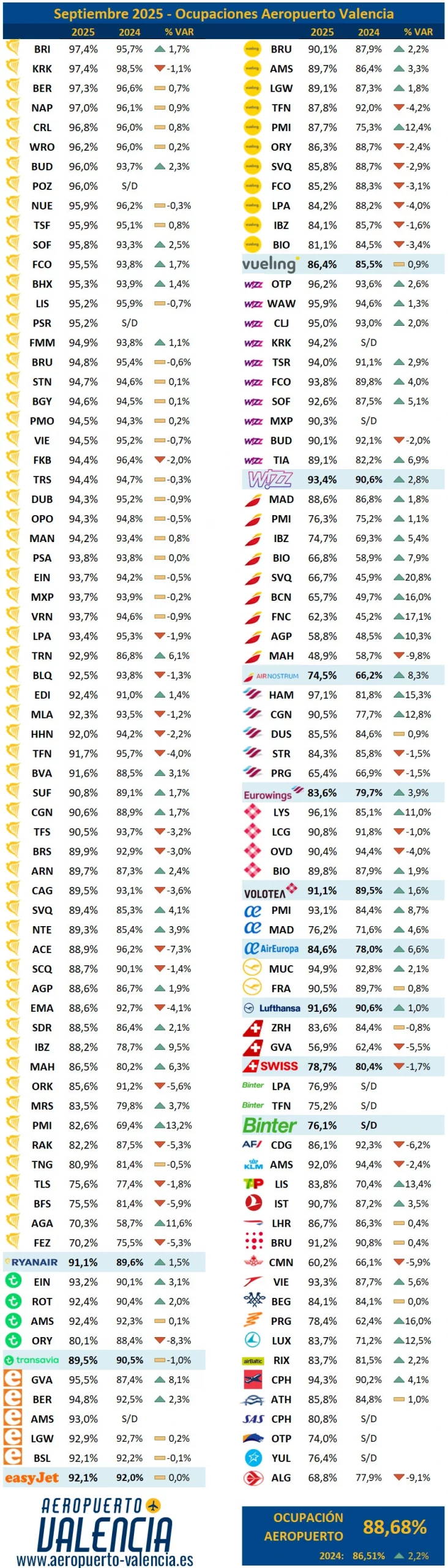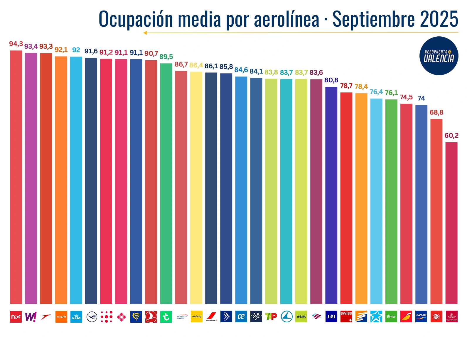 La ocupación media del aeropuerto sube más de 2 puntos respecto al año pasado, ronzando el 89% de ocupación media del aeropuerto. La mayor ocupación de este mes la registra, por sorpresa, Norwegian, que ya únicamente con la ruta de Copenhague supera el 94% en septiembre. Wizz Air se coloca como la aerolínea con mayor ocupación de las principales y Austrian completa el podio, registrando un mes más una alta ocupación.