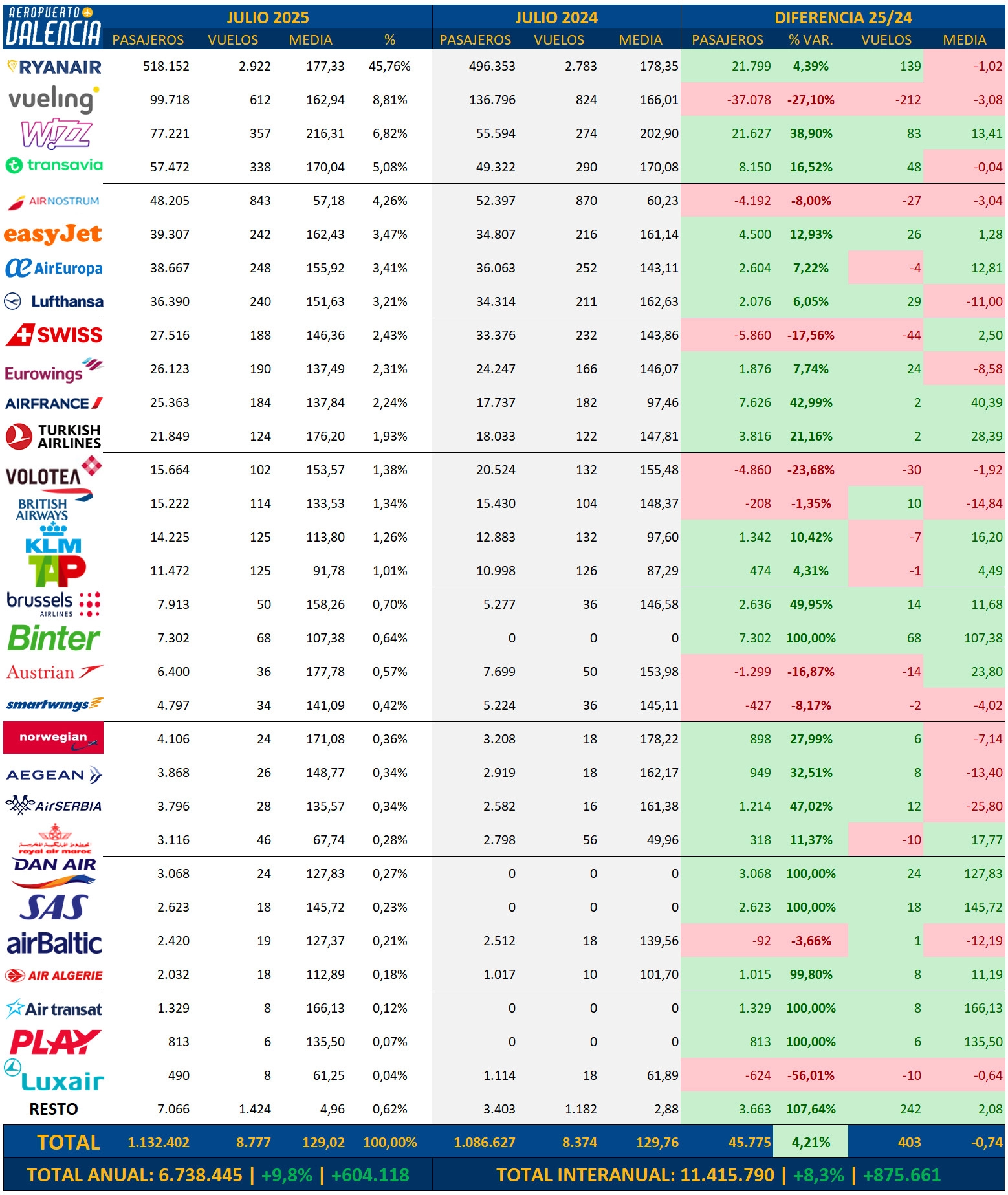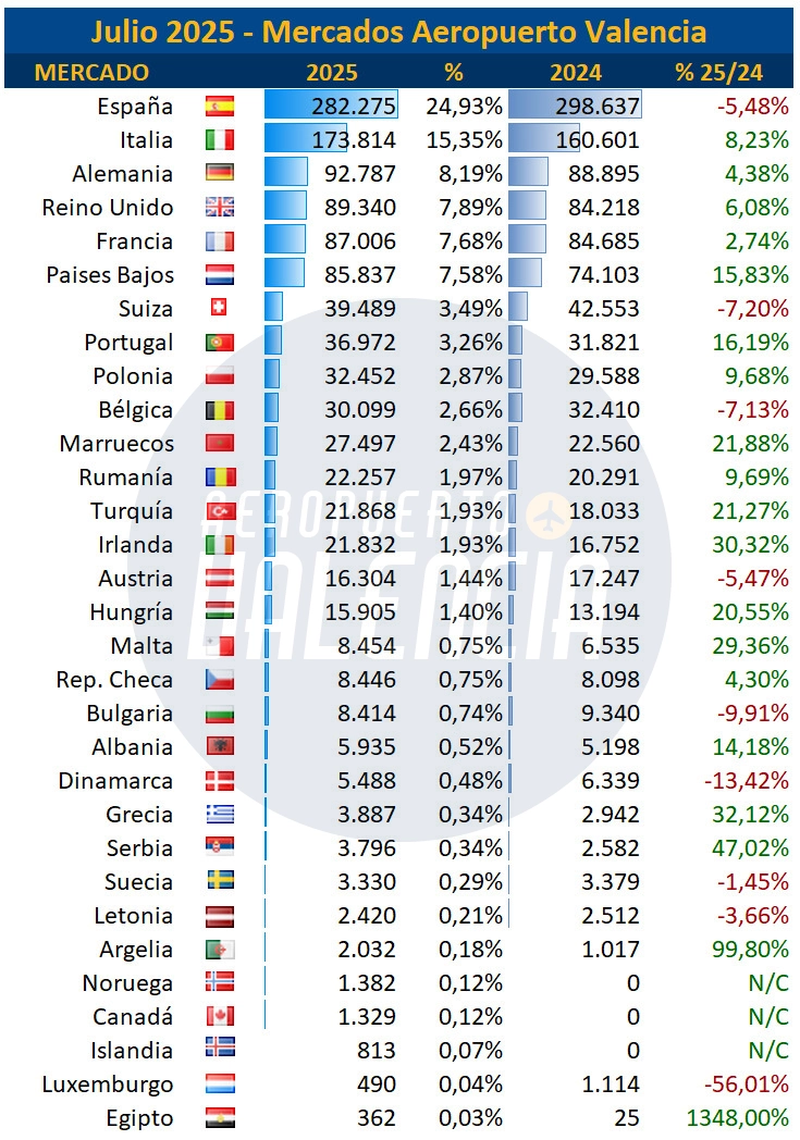 El total de pasajeros que volaron desde Manises en el julio de 2025 ha sido de 1.132.402 pasajeros, que representa un incremento del 4,2% respecto al mismo mes del año pasado. Es el incremento porcentual más bajo del año, pero al ser sobre los meses de más tráfico representa más de 45.000 pasajeros nuevos en una infraestructura que empieza a estar al límite de sus capacidad. Este incremento se produce además en el escenario donde dos de las principales compañías del aeropuerto, Vueling y Volotea, han reducido su programación sensiblemente respecto al año anterior, pero que ha quedado compensado por la entrada de nuevas aerolíneas y nuevos destinos.