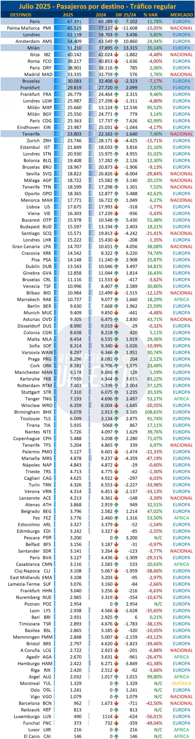 El tráfico nacional sigue estancado y se refleja también en su primer destino, Palma de Mallorca, que sigue siendo el primer aeropuerto de destino desde Valencia pero pierde un 15% de sus pasajeros, y se le acerca Ámsterdam que aumenta casi un 25%. El primer destino continúa siendo París, que con la suma de sus tres aeropuertos suma más de 67k pasajeros y aumenta más de un 11%.