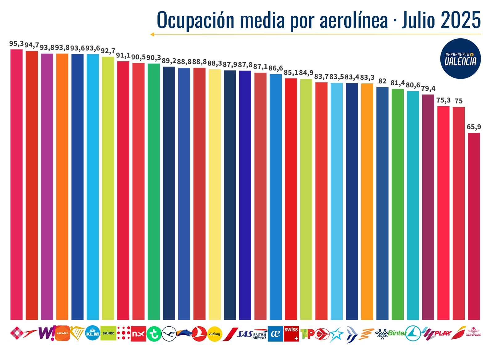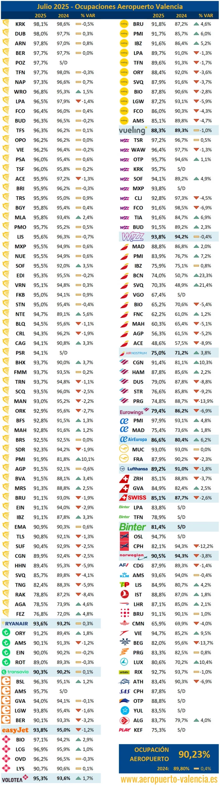 La mayor ocupación media la registra Volotea, que pese a su recorte de rutas ha aumentado su ocupación en las rutas que permanecen. Austrian se sitúa en segunda posición aumentando casi 10 puntos respecto al año pasado. Y el podio lo completa Wizz Air, que pese a su aumento de programación ha registrado una ocupación media cercana al 94%. Sus rutas clásicas a Rumanía y las polacas funcionan muy bien, y las nuevas como FCO, TIA y BUD comienzan a registrar mejores ocupaciones que meses anteriores, síntoma de que se van asentando.