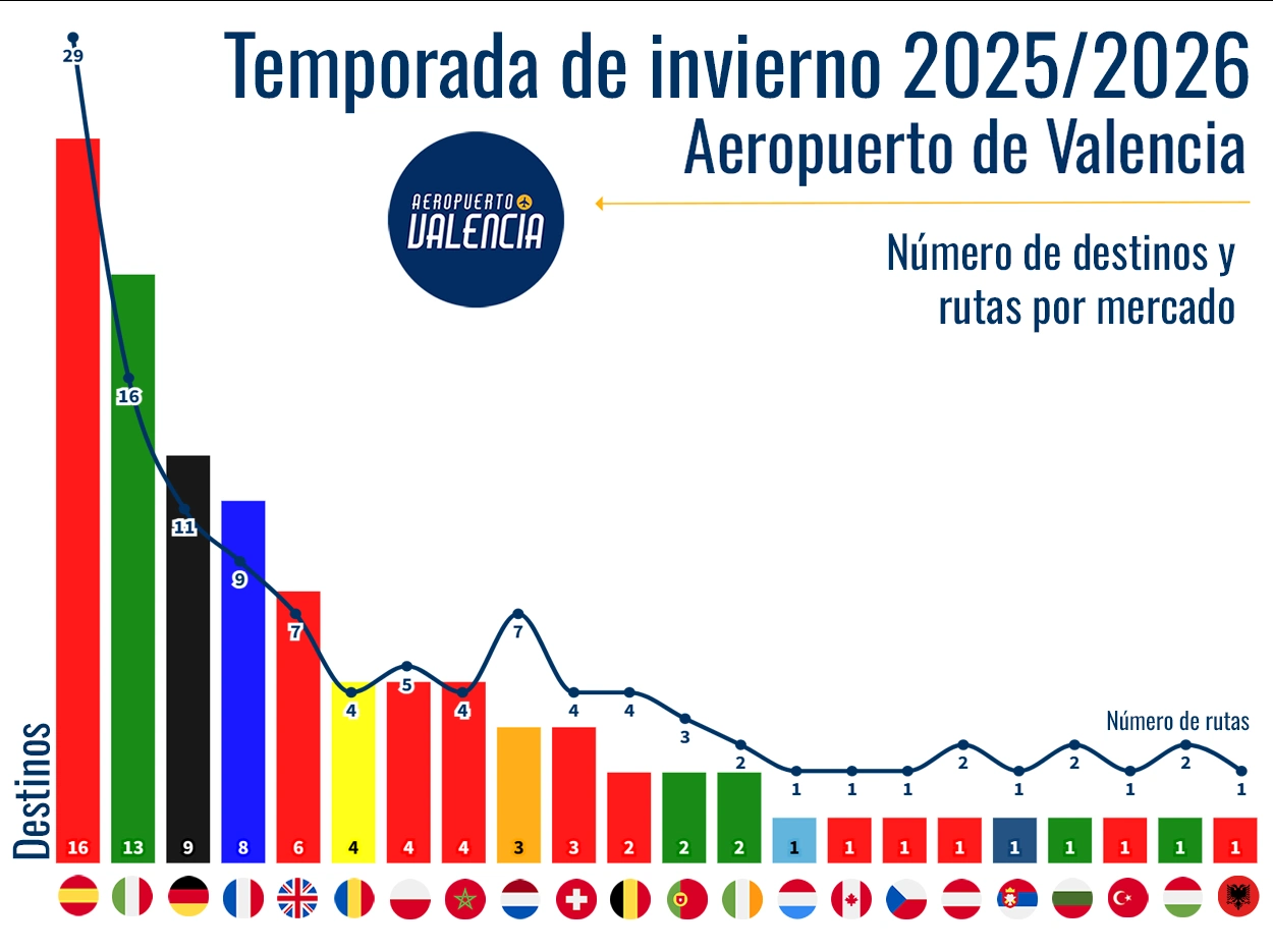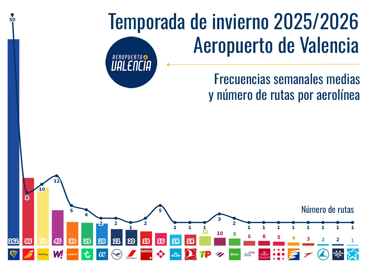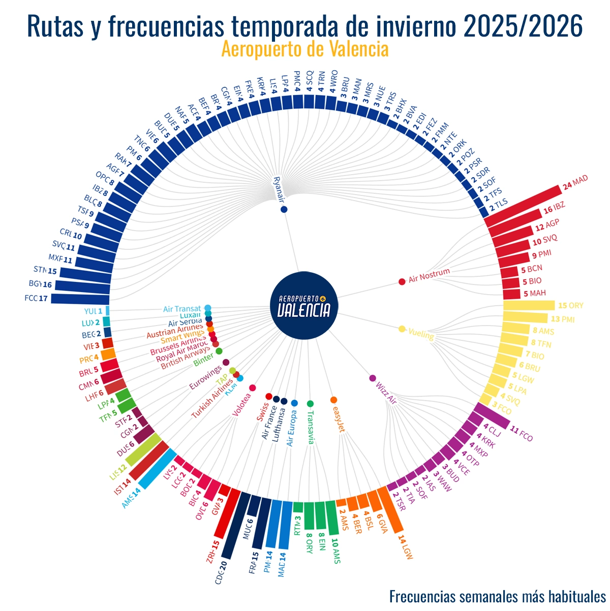 Este es un resumen de todas las rutas que se operarán desde el aeropuerto de Valencia durante la temporada de invierno 2025/2026, incluyendo las frecuencias semanales más habituales de cada mes, aunque algunas rutas tienen frecuencias muy variables incluso dentro del mismo mes.